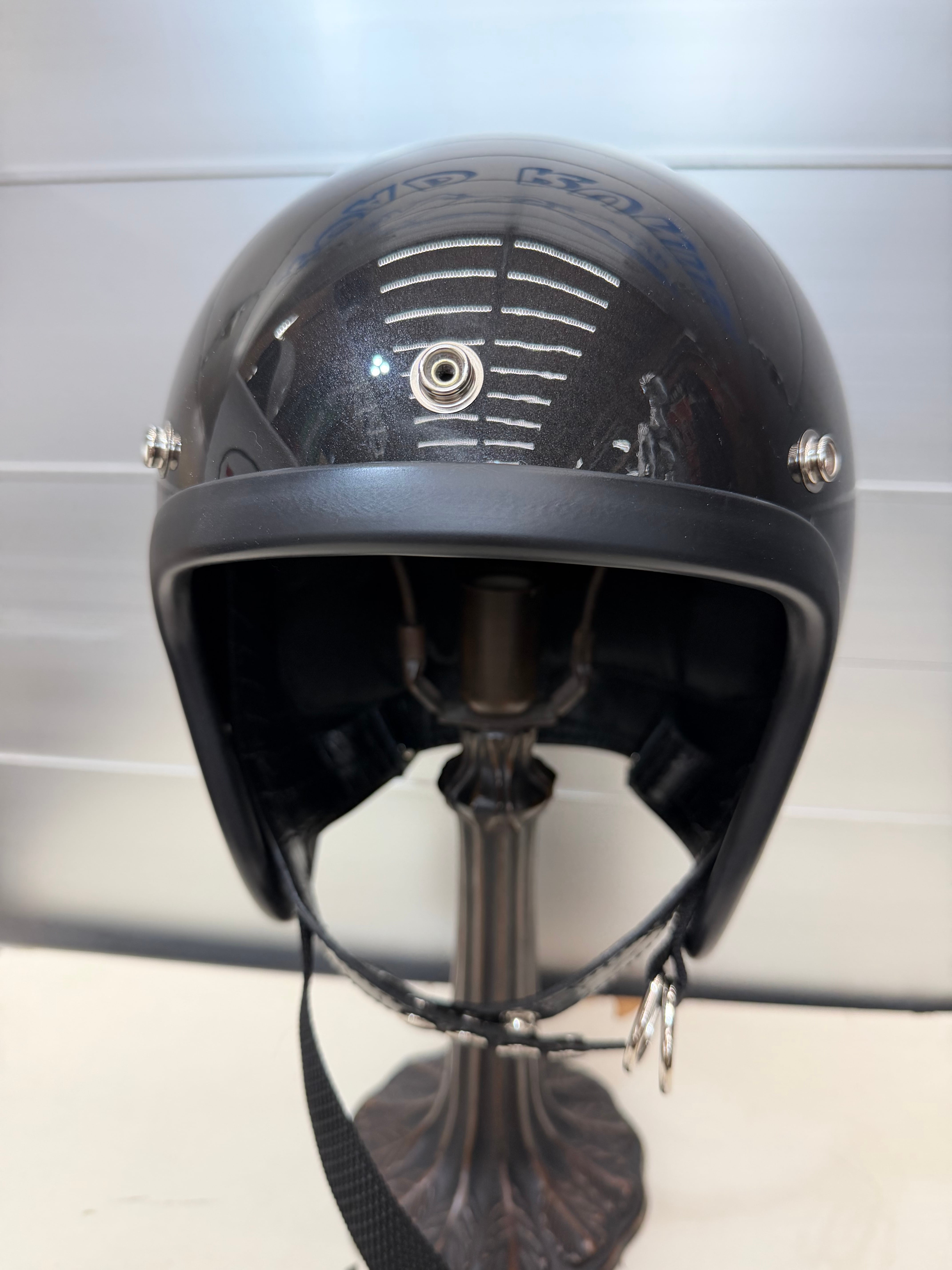 オールドヘルメットはダブルストラップの仕様が多く使われていて、金具、レザー部分がよりカッコ良さを引き立てます。
