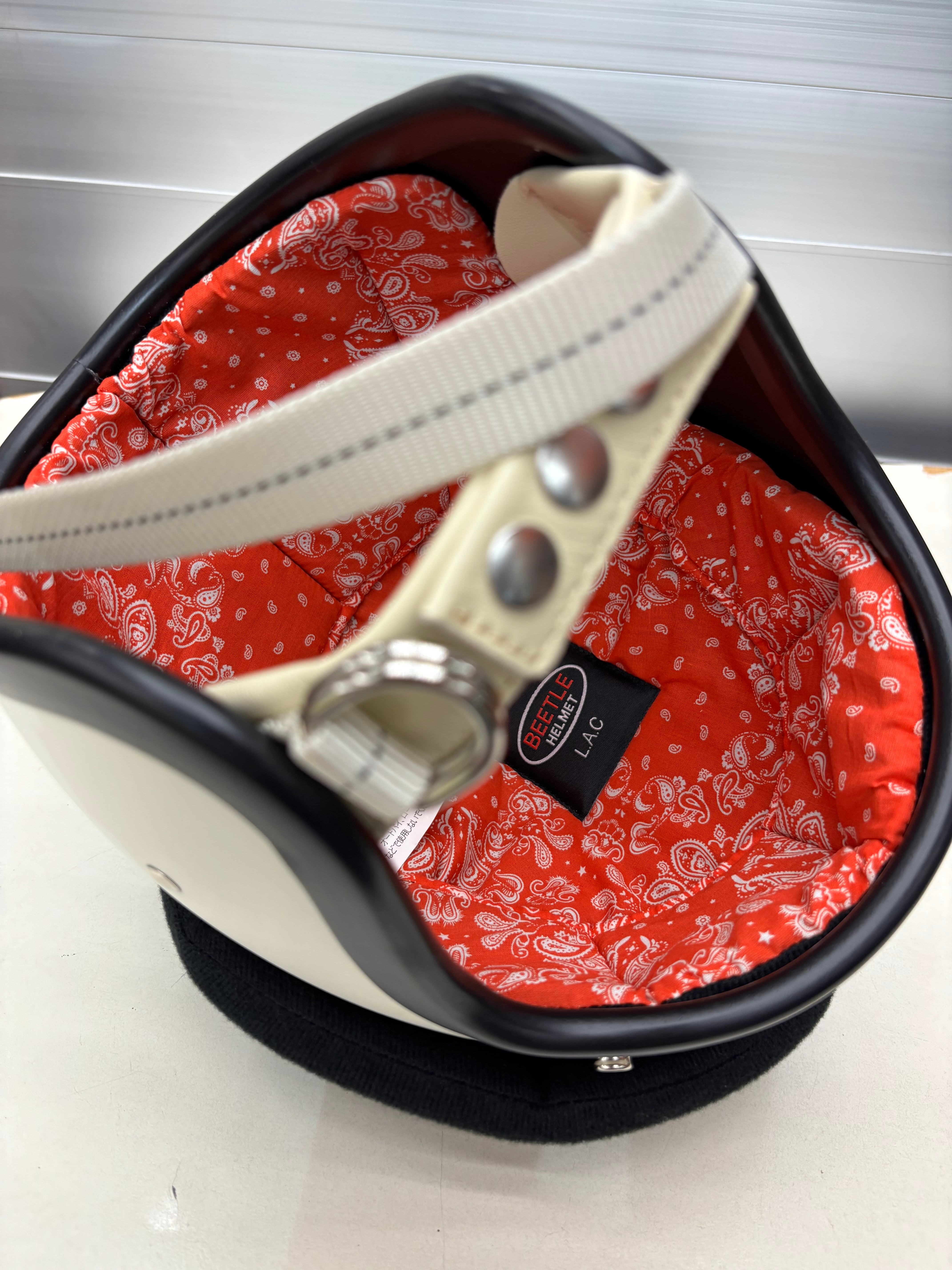 オールドヘルメットはダブルストラップの仕様が多く使われていて、金具、レザー部分がよりカッコ良さを引き立てます。